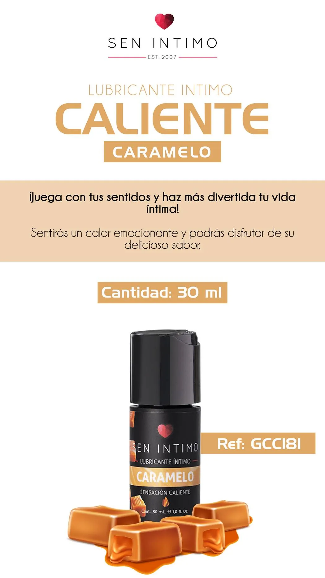 Lubricante Intimo Caliente con sabor a Caramelo, producto fabricado a base de agua y es ideal para ser utilizado en relaciones sexuales vaginal, anal u oral brindando una optima lubricación y disfruta de momentos inolvidables.