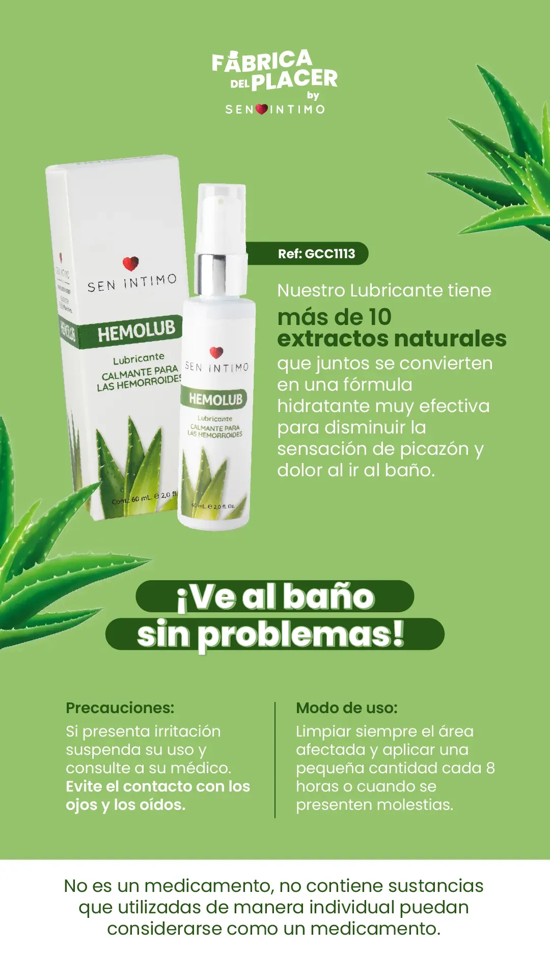 ¡Ve al baño sin problemas! Nuestro Lubricante tiene más de 10 extractos naturales que juntos se convierten en una fórmula hidratante muy efectiva para disminuir la sensación de picazón y dolor al ir al baño, además de reactivar la circulación de las venas hemorroidales. Modo de uso: Limpiar siempre el área afectada y aplicar una pequeña cantidad cada 8 horas o cuando se presenten molestias. Precauciones: Si presenta irritación suspenda su uso y consulte a su médico.mantenga este producto fuera del alcance de los niños,consérvese el empaque bien tapado en un lugar fresco y seco.evite el contacto con los ojos y los oídos.no dejar mas de 8 horas,limpiar bien el área,antes de la aplicación y ala hora de retirar el producto.no es un medicamento, no contiene sustancias que utilizadas de manera individual puedan considerarse como un medicamento.