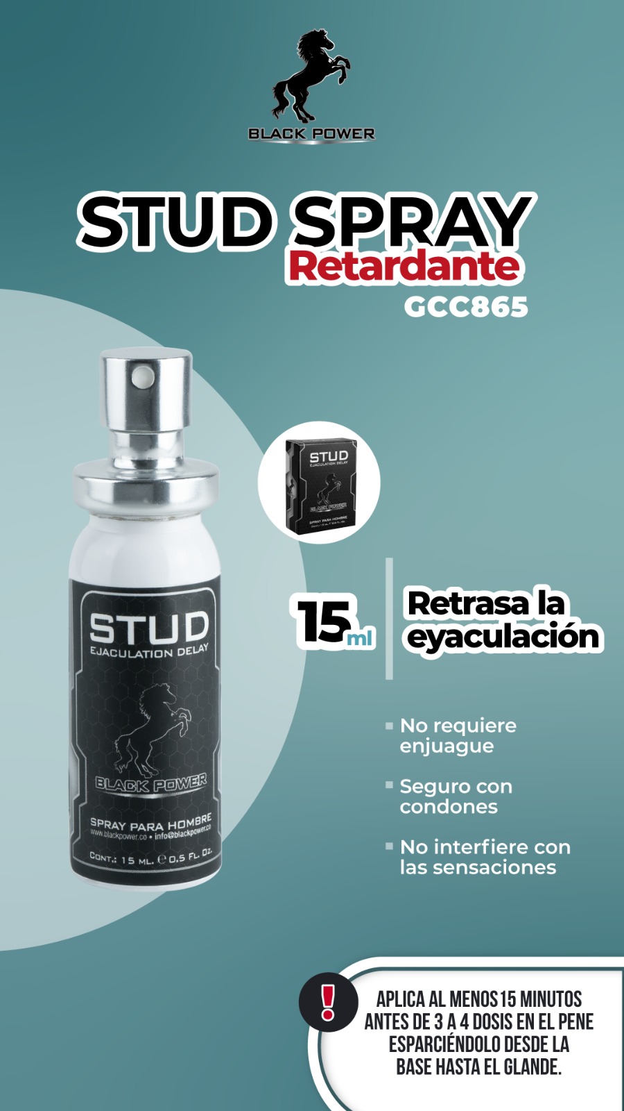 Stud Spray de Black Power es un lubricante íntimo especialmente formulado para ayudarte a prolongar los momentos de placer y retrasar la eyaculación de forma segura y efectiva. Perfecto para quienes desean disfrutar con mayor control, no adormece ni interfiere con las sensaciones.